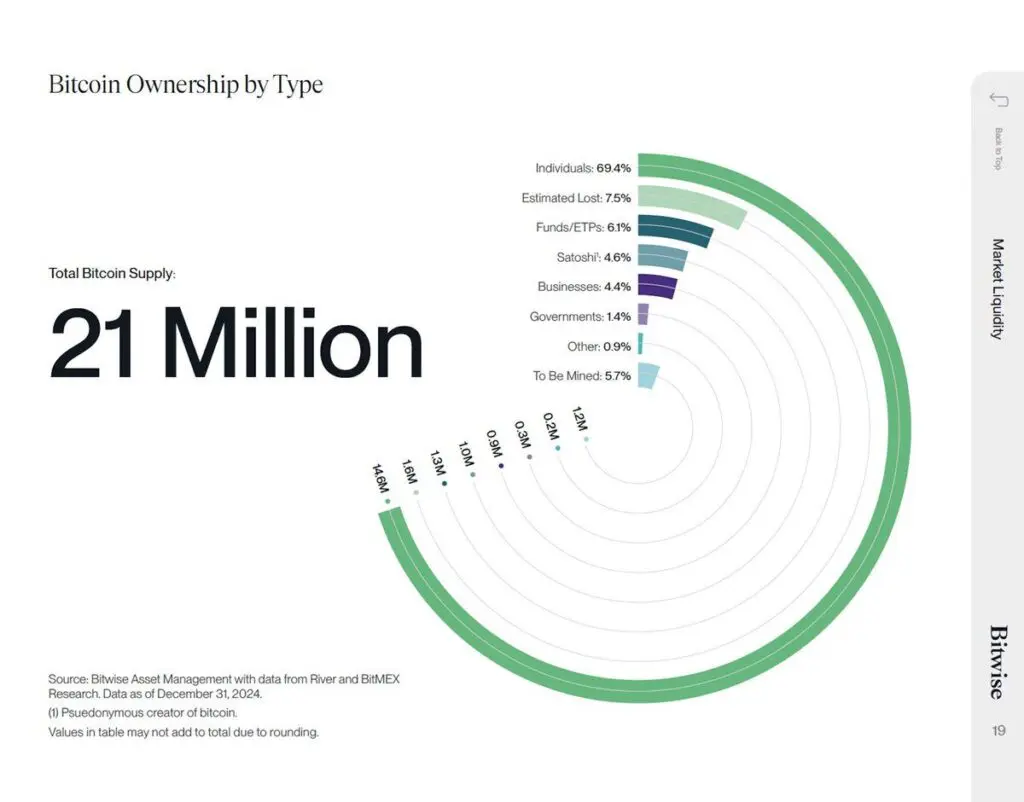 De acordo com a Bitwise Asset Management, 69,4% do fornecimento total de Bitcoin, que equivale a 21 milhões de BTC, pertence a investidores individuais. Essa concentração de propriedade pode representar um grande desafio para grandes instituições e governos que desejam adquirir participações em Bitcoin.