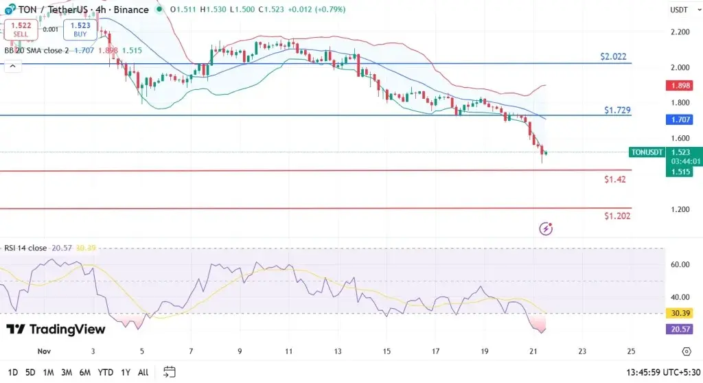 A recente falha técnica relacionada com a Cloudflare também prejudicou a reputação de estabilidade do ecossistema TON. Apesar deste contexto desfavorável, o volume em 24 horas disparou 58%, sinal de uma intensa atividade de reposicionamento. De um ponto de vista técnico, se o preço quebrar o suporte aos 1,42 $, uma descida rápida para os 1,20 $ torna-se provável antes de qualquer ressalto significativo.