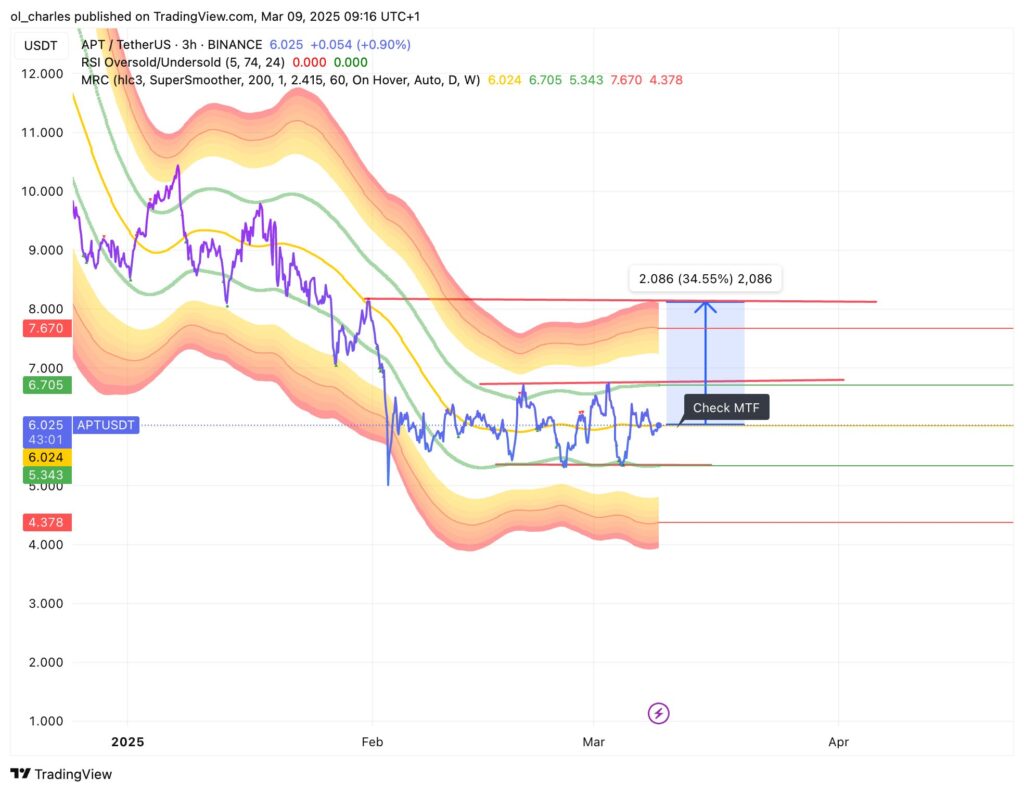 De acordo com o Preço de Reversão Médio, em caso de inversão de tendência altista do token e do mercado, o APT pode buscar a resistência em 8 dólares, uma valorização potencial de 34% nos próximos dias.