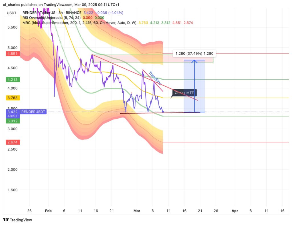 Se o RENDER confirmar seu duplo fundo, um reteste da resistência em 4,7 dólares é possível a curto prazo. Isso representaria um aumento de 37% em relação ao preço atual.