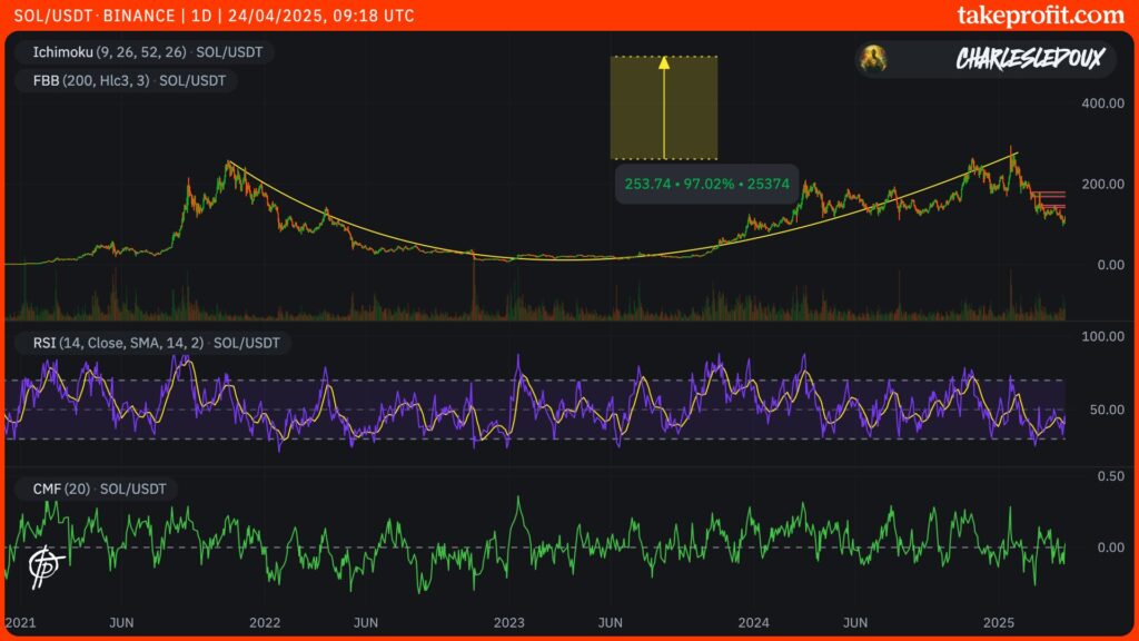 Do ponto de vista gráfico, o preço da Solana está atualmente a formar um padrão técnico muito otimista, conhecido como ‘copo e asa’. Este padrão sugere um potencial de valorização teórica até aos 515 $, mais do que o dobro dos níveis atuais.