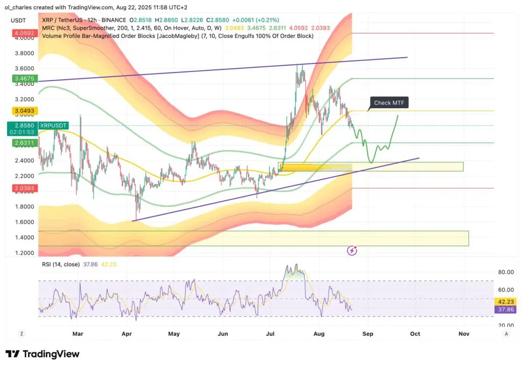 Além disso, esta queda permitiria liquidar a trendline a 2,8 dólares, libertando o XRP dos longos tardios.