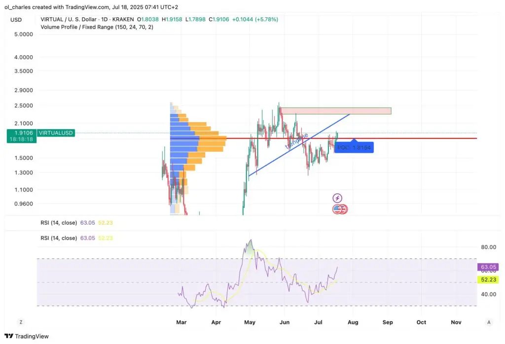 O protocolo Virtuals (VIRTUAL) viu o seu preço aumentar 12% nas últimas 24 horas, negociando atualmente a 1,91$. Este é o seu fecho diário mais elevado desde o final de junho, com um volume de transações a subir significativamente em 67%. Esta subida confirma uma saída do intervalo de consolidação que mantinha o token entre 1,50$ e 1,80$ durante grande parte do mês de julho.