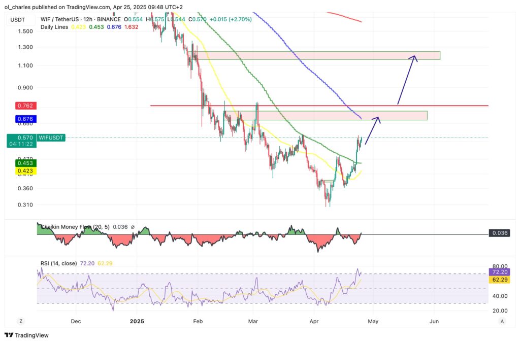 Depois de atingir um pico histórico de 4,9 $, o WIF caiu para 0,29 dólar no início do mês. Desde então, subiu 84% para negociar atualmente em torno de 0,57 $.