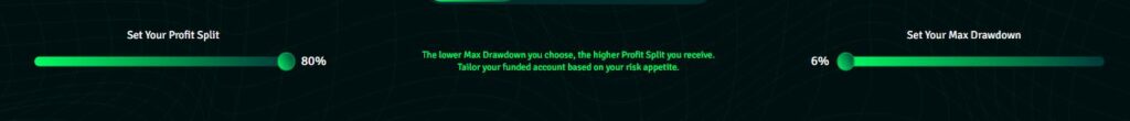 La plateforme propose une gamme de tailles de comptes allant de 2 500 $ jusqu’à 500 000 $, offrant une flexibilité notable aux traders de différents niveaux. Le partage des bénéfices (profit split) est également attractif, pouvant atteindre 80 %. Ce pourcentage est directement lié au niveau de risque que le trader choisit d’accepter, notamment via la règle de perte maximale (maximum loss) autorisée sur le compte, qui peut varier entre 6 % et 10 %.